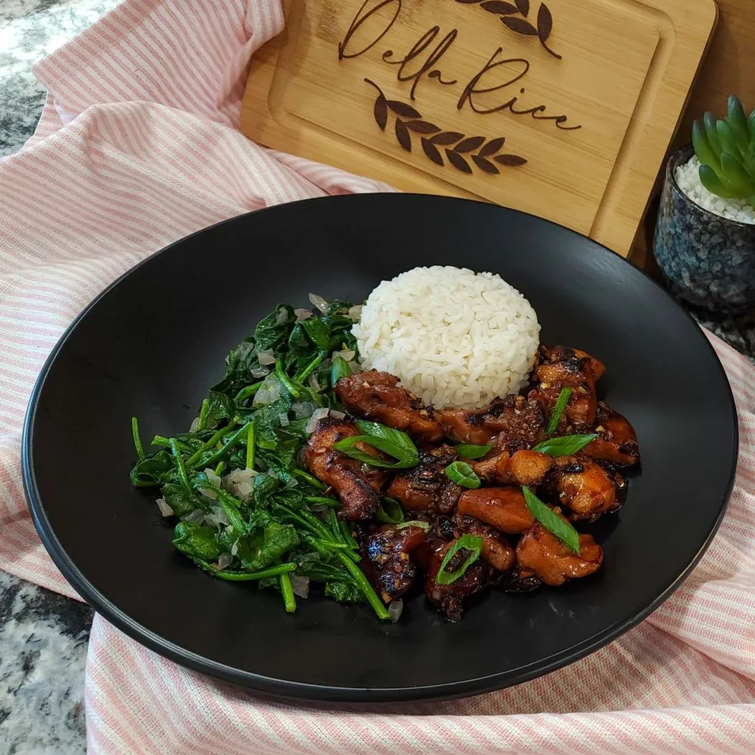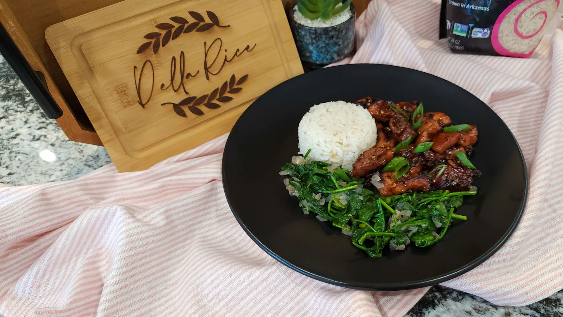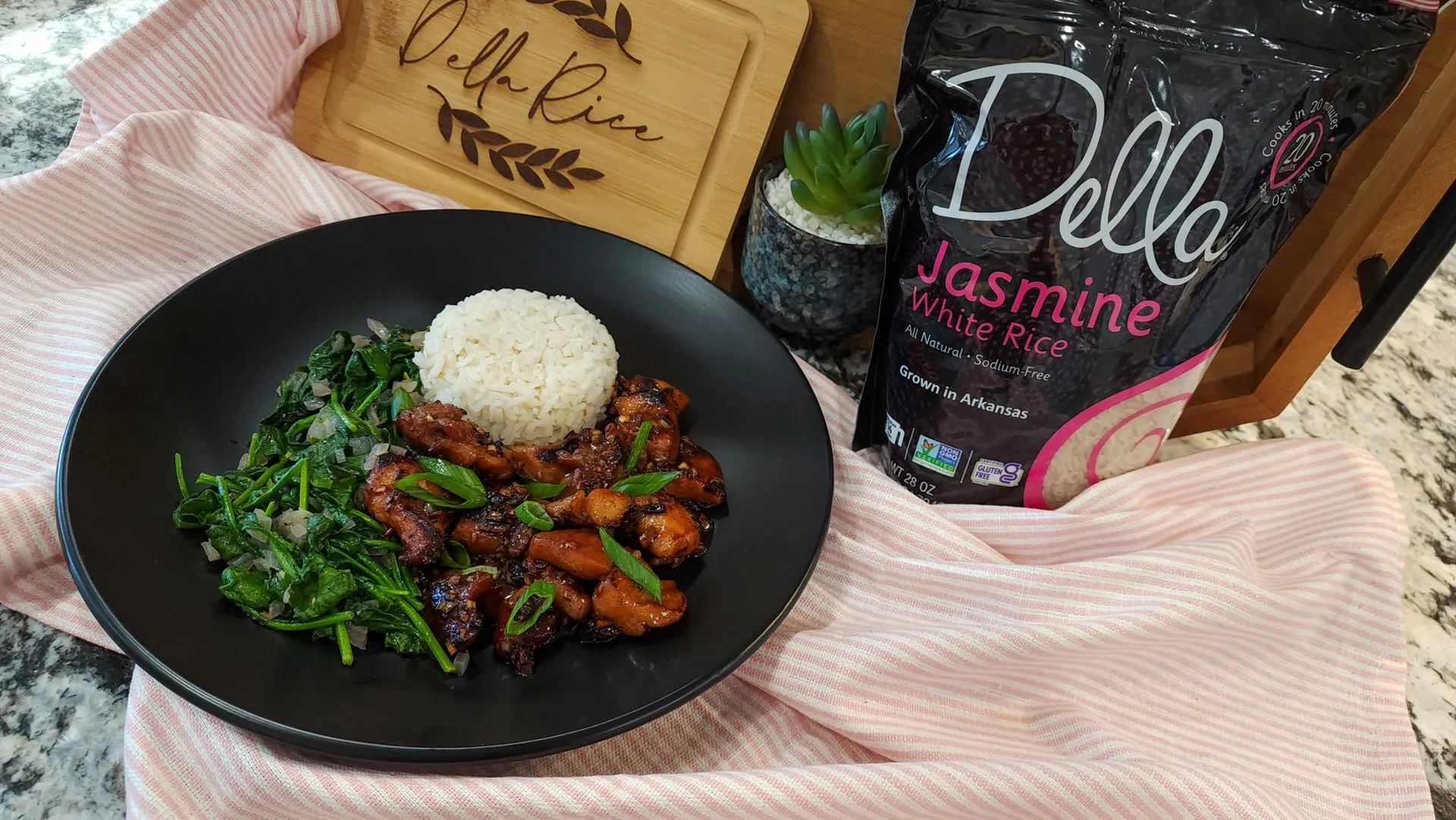 - Cook the Della Jasmine Rice as directed. Prepare the vegetables and garnish.