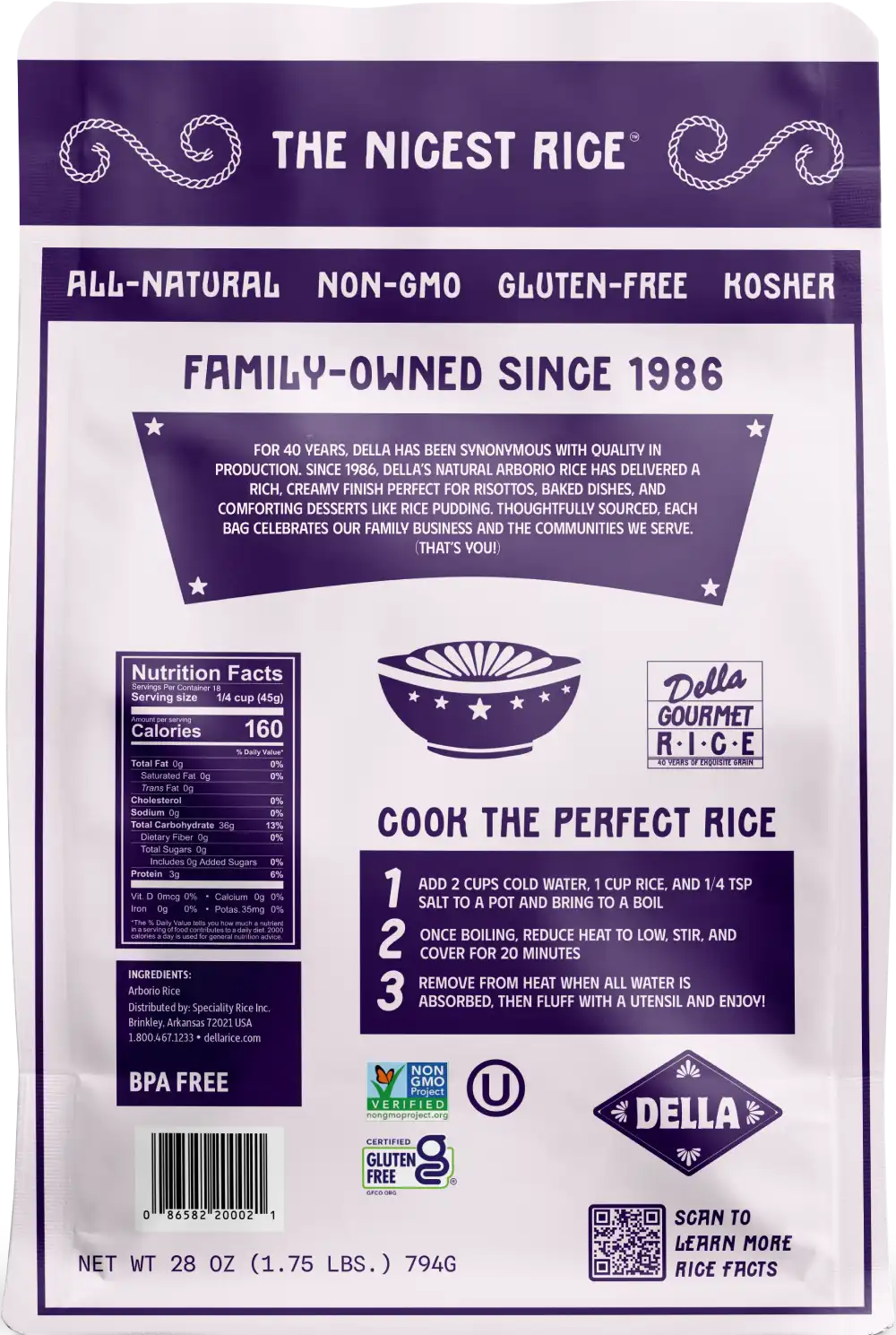 The secret to a perfect risotto starts with the right grain. Della’s Arborio rice has the high starch content needed to create that signature creamy, velvety texture while maintaining a satisfying bite at the center. Grown domestically and crafted for consistency, it absorbs broths and flavors beautifully. Also wonderful for rice pudding, arancini, and other dishes that benefit from a rich, luxurious mouthfeel.