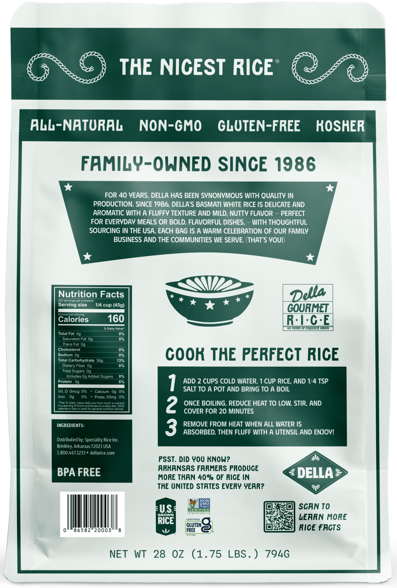 Long, slender grains with a delicate floral aroma and buttery flavor. Della’s white basmati elongates beautifully when cooked, producing light, separate grains that are perfect for pilafs, biryanis, and as an elegant side dish. Grown in the rich soils of Arkansas, this aromatic rice brings restaurant-quality results to your home kitchen.