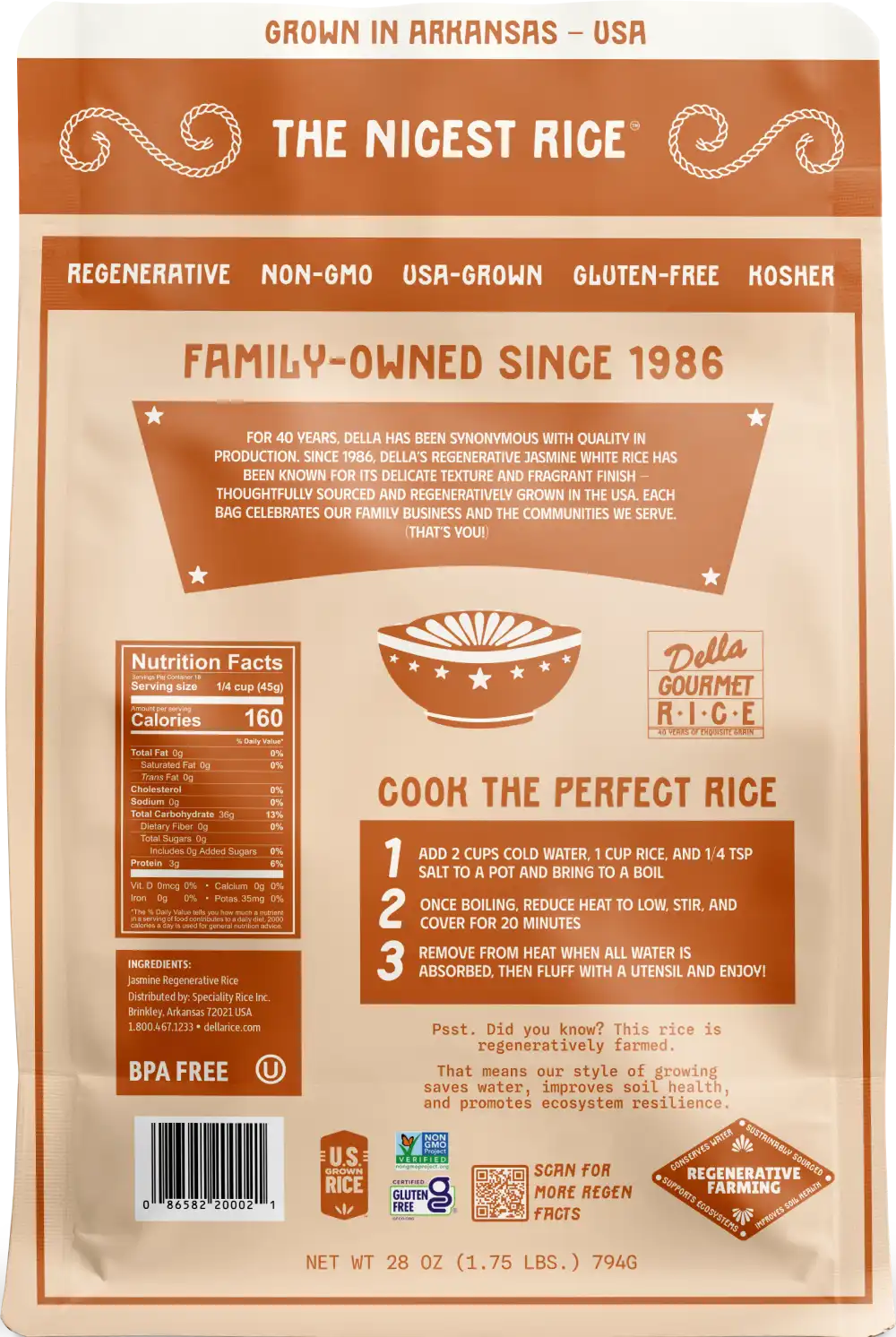 Soft, subtly sweet, and wonderfully fragrant. Della’s jasmine rice has a naturally floral aroma that fills your kitchen as it cooks. The grains cling together just enough for easy eating while staying fluffy and moist. A staple for Southeast Asian cuisine, it pairs equally well with bold curries and simple weeknight meals.