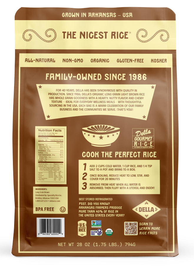 Certified organic and grown with care for the land. This light brown rice delivers a mild, earthy flavor and tender texture with the peace of mind that comes from organic farming. No synthetic pesticides, no artificial fertilizers — just pure, wholesome rice from family farms committed to sustainable agriculture. A nutrient-rich foundation for any meal.