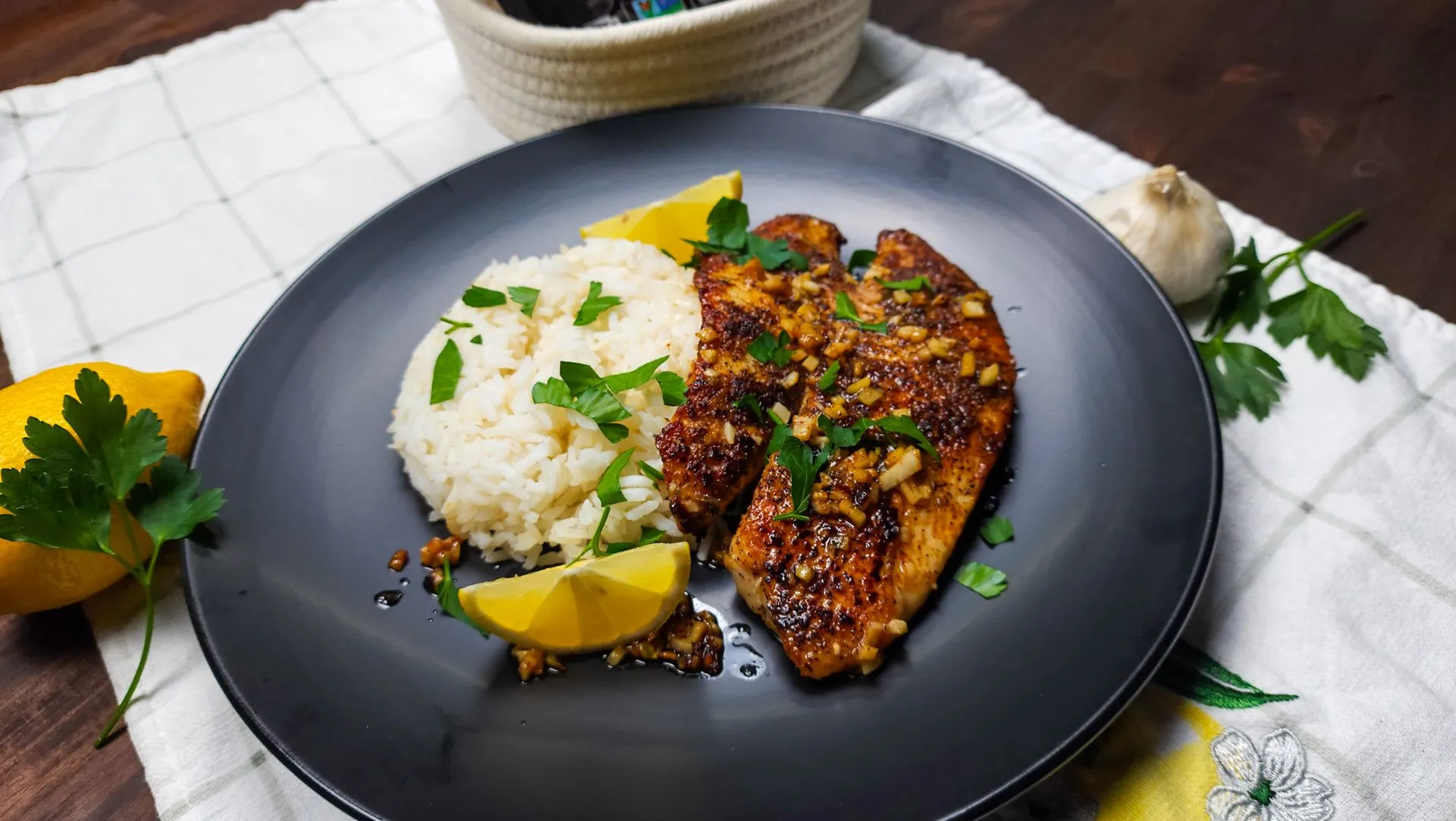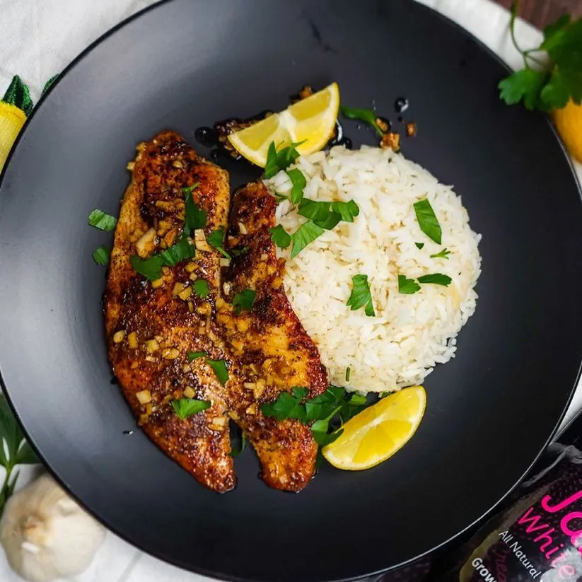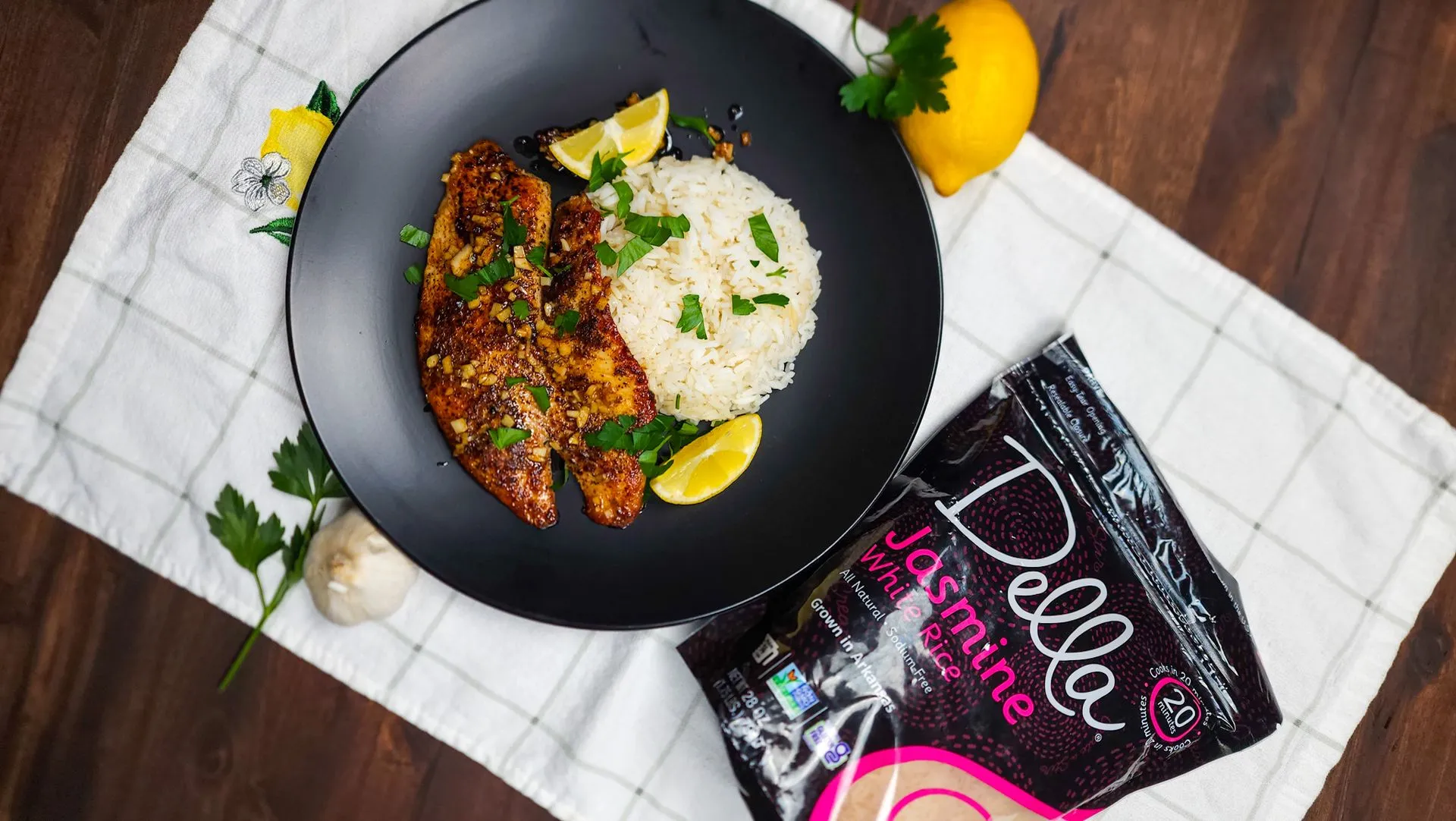 - Serve fish with cooked Della Jasmine Rice, parsley, and lemon wedges. Enjoy!