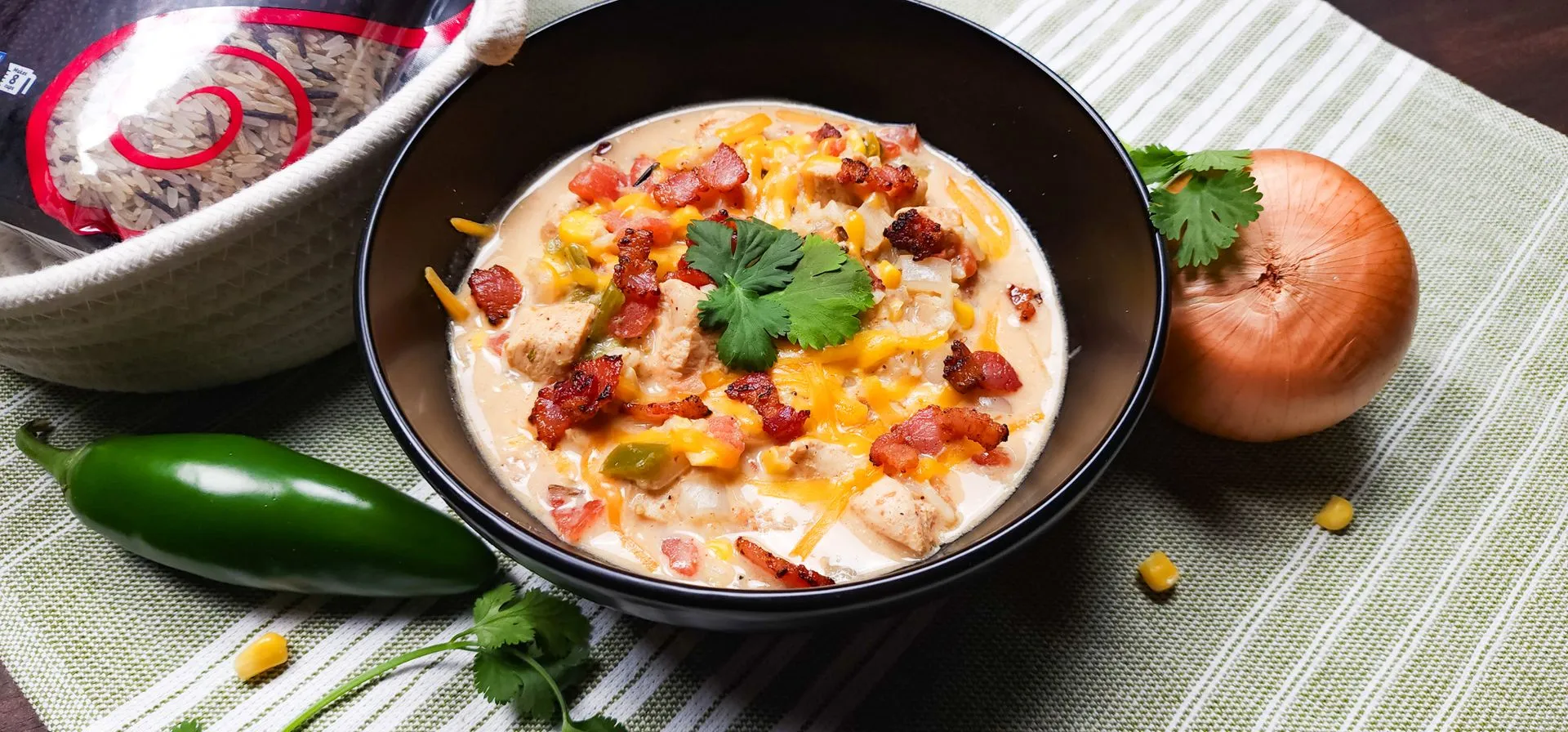 - Put onions, jalapeños, chicken, chicken broth, Della Basmati & Wild Rice, tomatoes with green chilis, corn, chili powder, cumin, oregano, salt, and pepper into the Instant Pot. Mix everything well, so the chicken and rice is covered in broth. Close the lid.