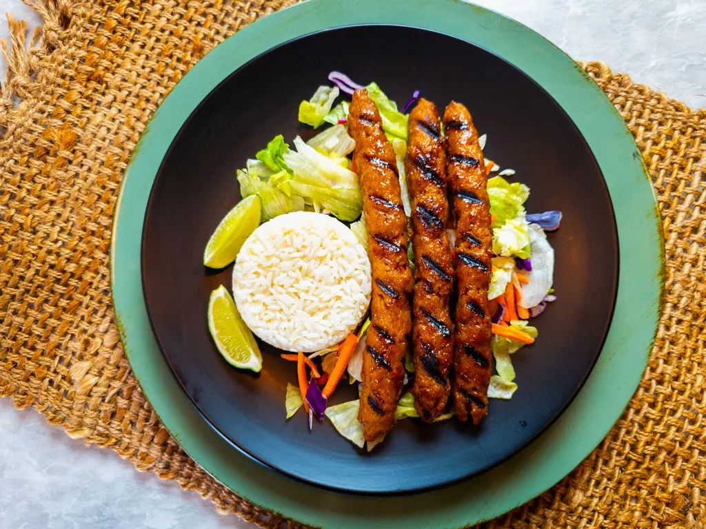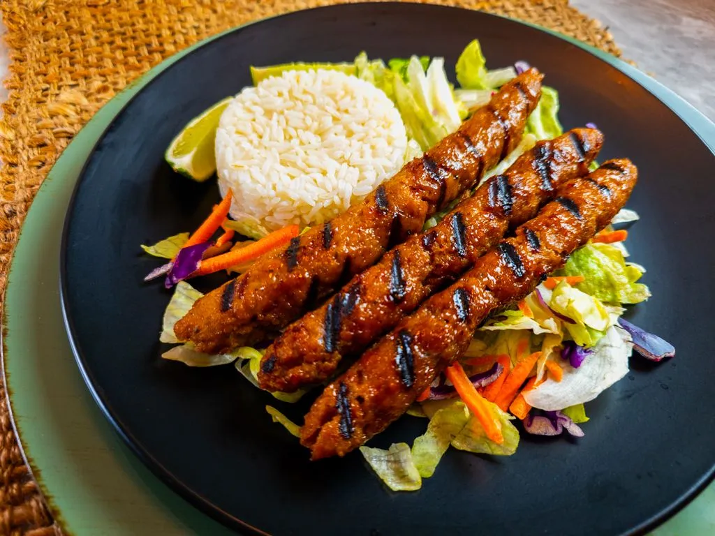 Filipino-Styled BBQ Skewers over Salad and Jasmine Rice