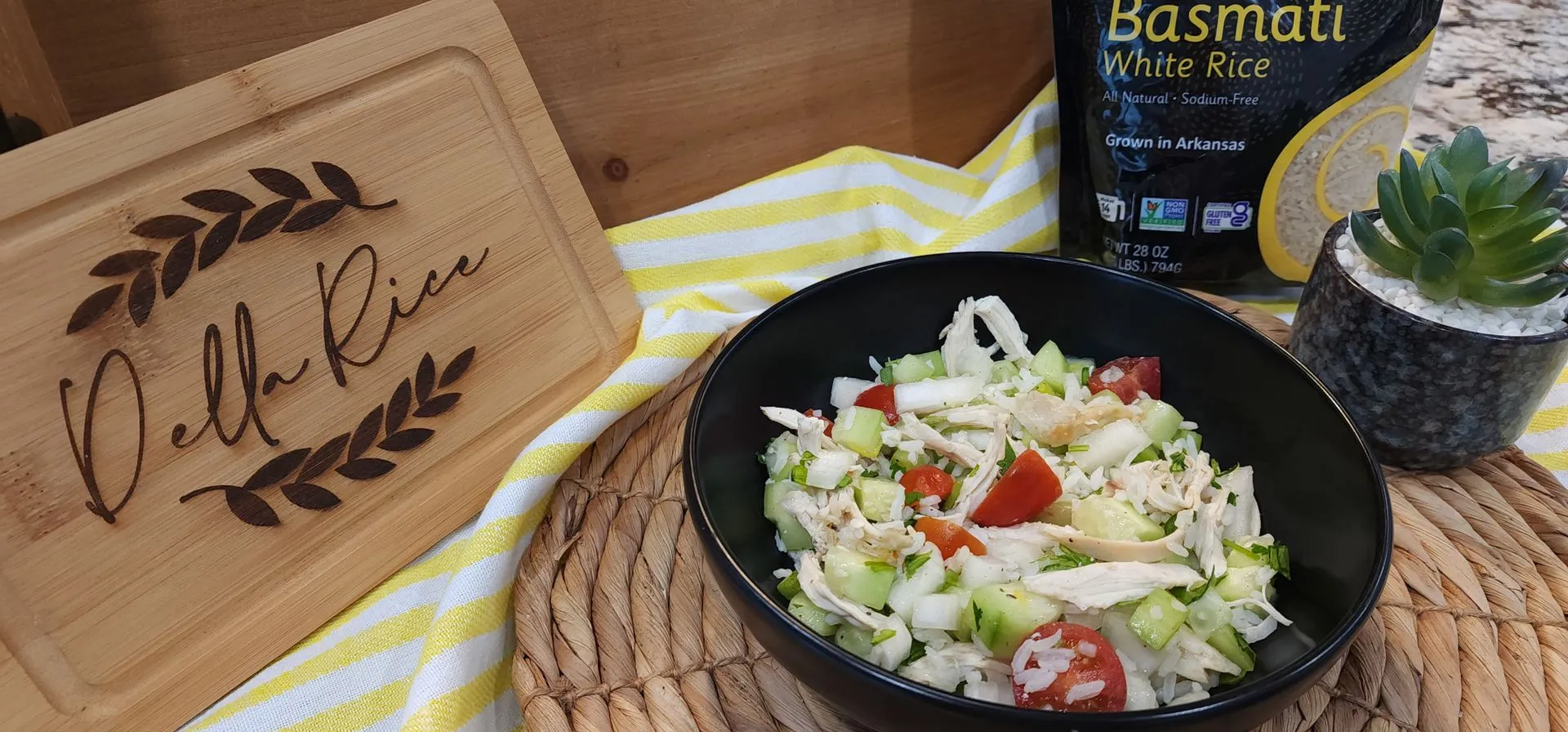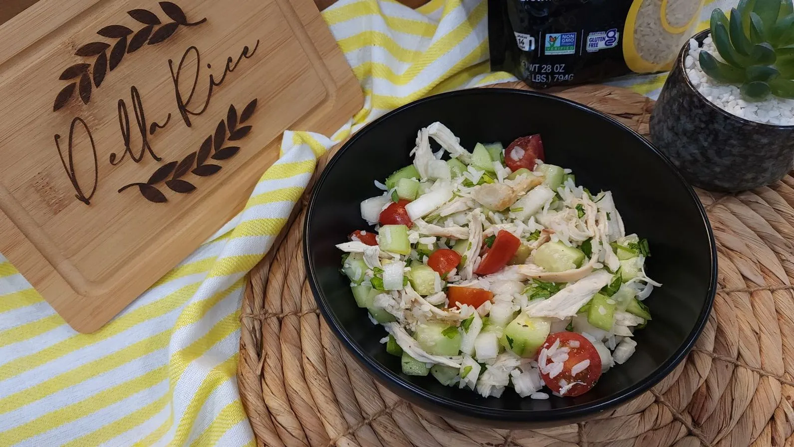 - Grab a salad bowl and add in the cooked shredded chicken, rice, celery, cucumber, cherry tomato, sweet onion, and parsley. Drizzle in the lemon dressing. Toss to combine well.
