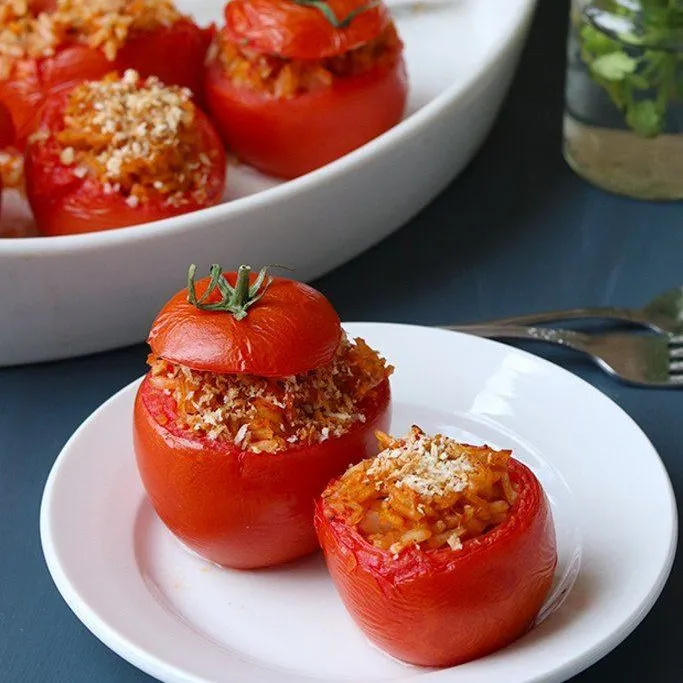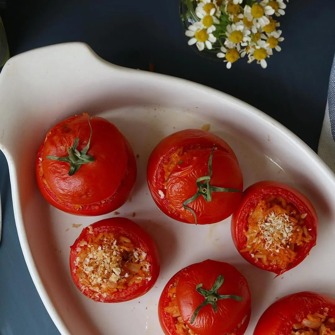 Stuff tomatoes with rice mixture, sprinkle with bread crumbs and place on an oven sheet or pyrex.