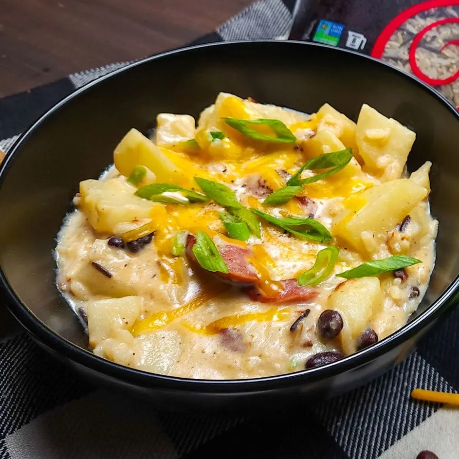- Add milk, cheese, green onion, black beans, garlic powder, salt, and pepper.