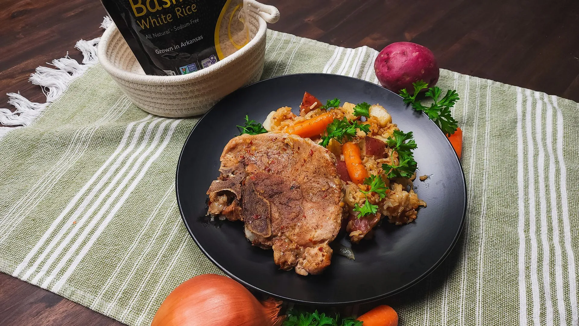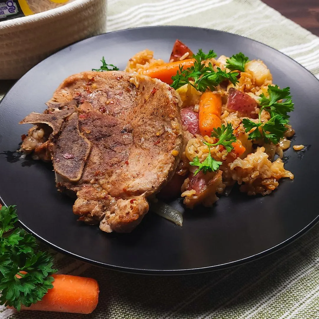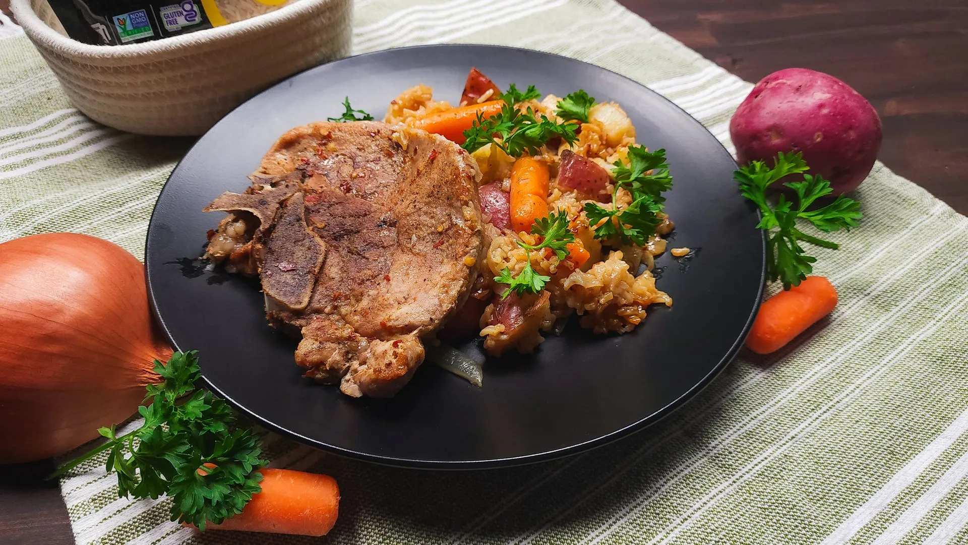 - Then add in the beef broth, soy sauce, potato, carrot, and the rest of the seasoning mix. Stir until mixed. Then add on top the browned pork loin chop. Close the lid and and set the InstantPot on High Pressure for 7 mins. Once done, let it natural pressure release for 10 minutes.