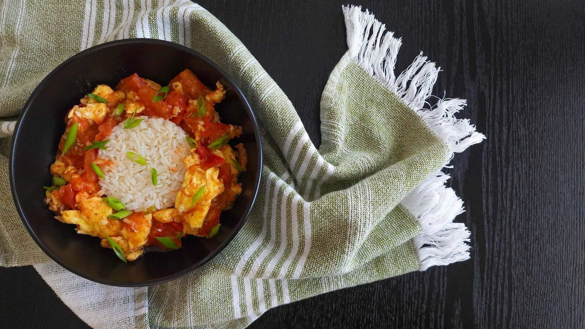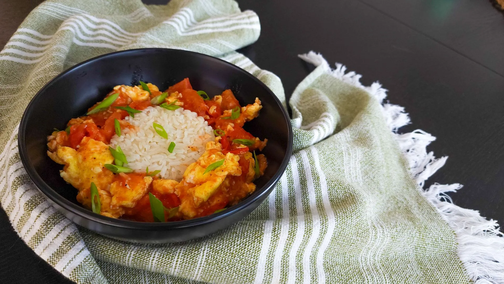 - Heat 1/2 tablespoon of oil in a non stick skillet over medium-high heat. Once heated, add in egg and cook until the bottom is done but the top is still a little bit raw. Mix and scramble the eggs into tiny pieces, until the eggs are cooked. Transfer to a plate.