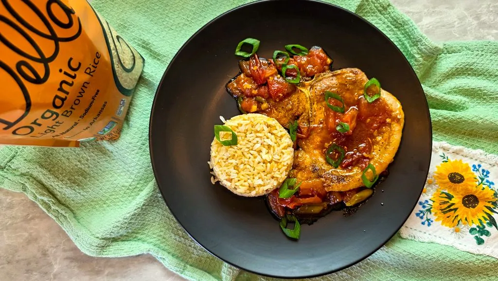 - Cook Della Basmati Brown Rice as instructed. Prep veggies. Season pork chops on both sides with salt & pepper